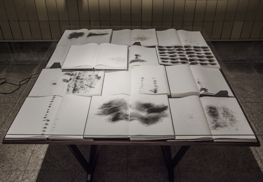 steht ein etwa 16m langer tisch mit der arbeit "ich